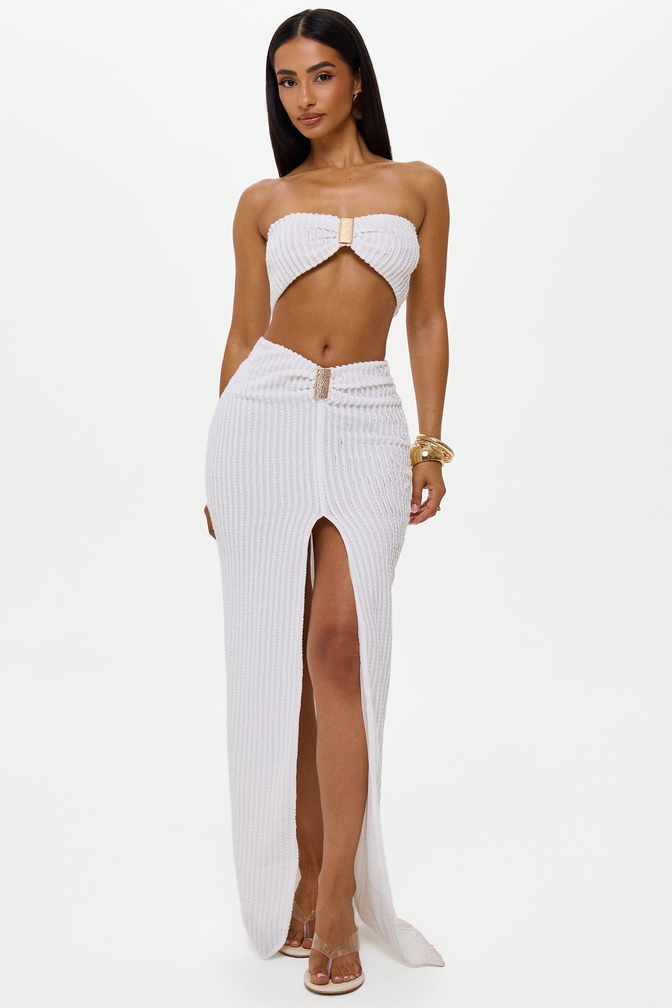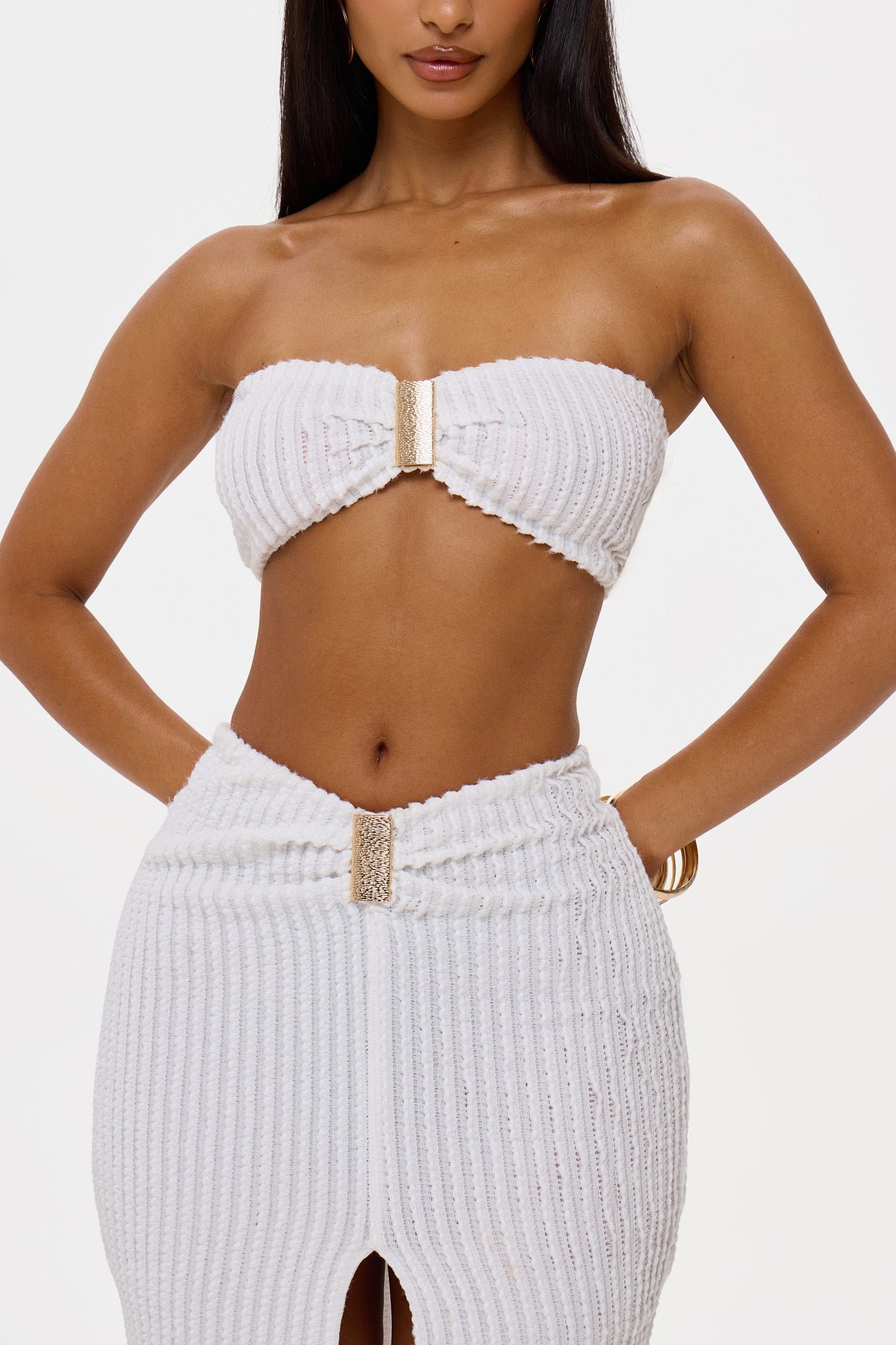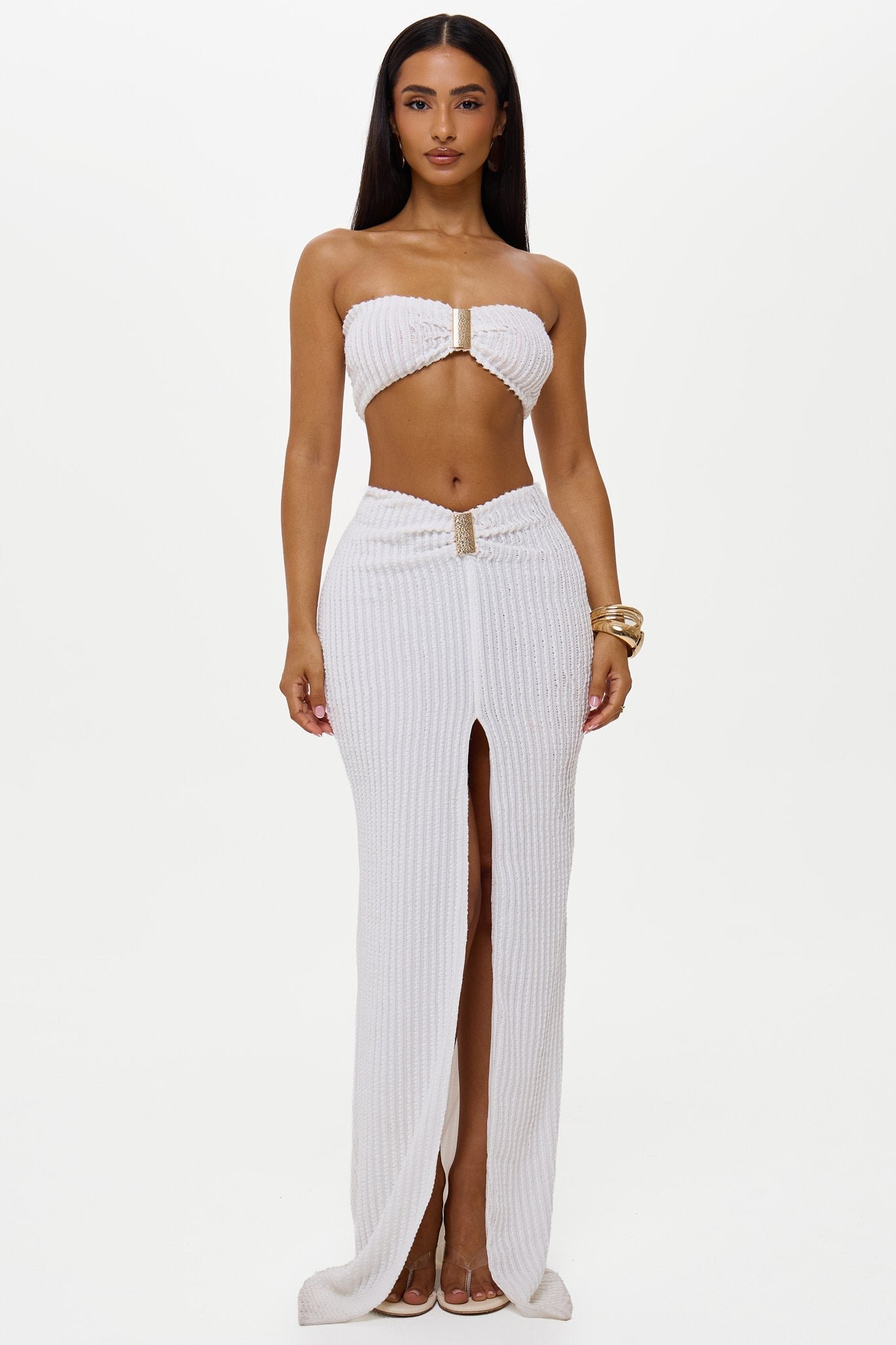 BLANCA Waffle Textured Maxi Skirt Co-ord Set with Bandeau Top Gold Trims