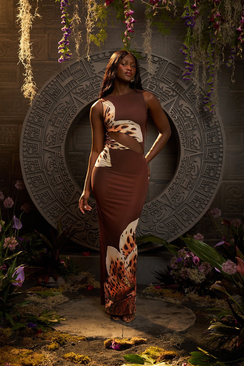 Elevate your wardrobe with the BLU leopard orchid placement print maxi dress, featuring a striking in-house exclusive design. This bodycon fit dress offers a maxi length of approximately 150cm from shoulder to hem (based on UK size 8), with a straight-cut skirt and centre back split at the hemline for easy movement. The slash detail on the front bodice and slash neckline add a bold, edgy touch, while the mesh outer layer over a stretch fabric inner layer ensures a flattering, comfortable fit. Bra-friendly design makes it versatile for various occasions, from evening events to stylish daywear. Model Maria, 5'8", wears a UK size 8. Perfect for those seeking a sophisticated yet daring leopard print maxi dress with premium stretch and mesh construction.