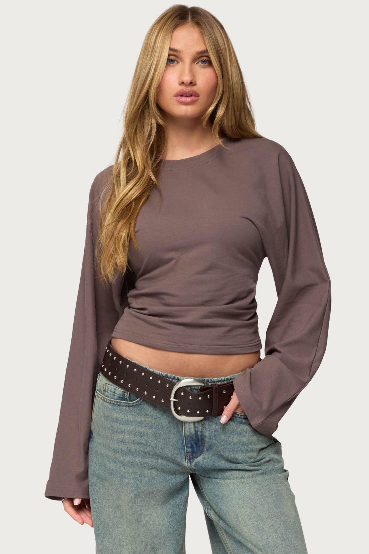 tops long-sleeve cinched-waist ruched cotton-spandex casual stretchy womens-tops everyday-top layering-top