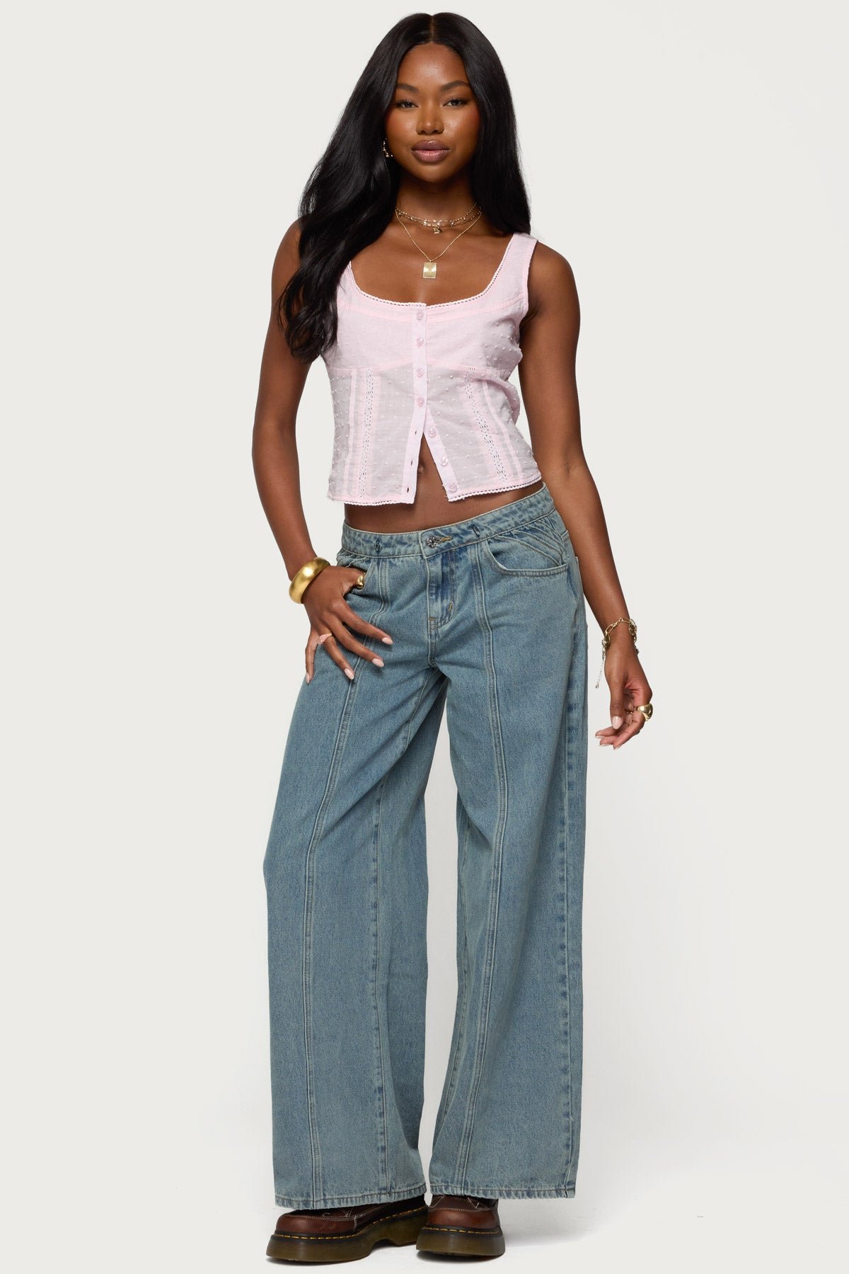 Elevate your casual wardrobe with this embroidered cotton button up tank top. Featuring a flattering square neckline, front button closures for easy wear, and a smocked back panel that adds a touch of stretch and shape. Delicate frill trim and lace detailing enhance the feminine appeal, while the embroidered dotted fabric provides a unique, textured look. Made from 100% cotton for breathable all-day comfort, perfect for warm weather layering or standalone styling. Ideal for vacation outfits, festival wear, or everyday casual looks. Model wears size S and is 5'9". Care instructions: Machine wash at maximum 30ºC, do not bleach, tumble dry low, iron at a maximum of 110ºC, do not dry clean.
