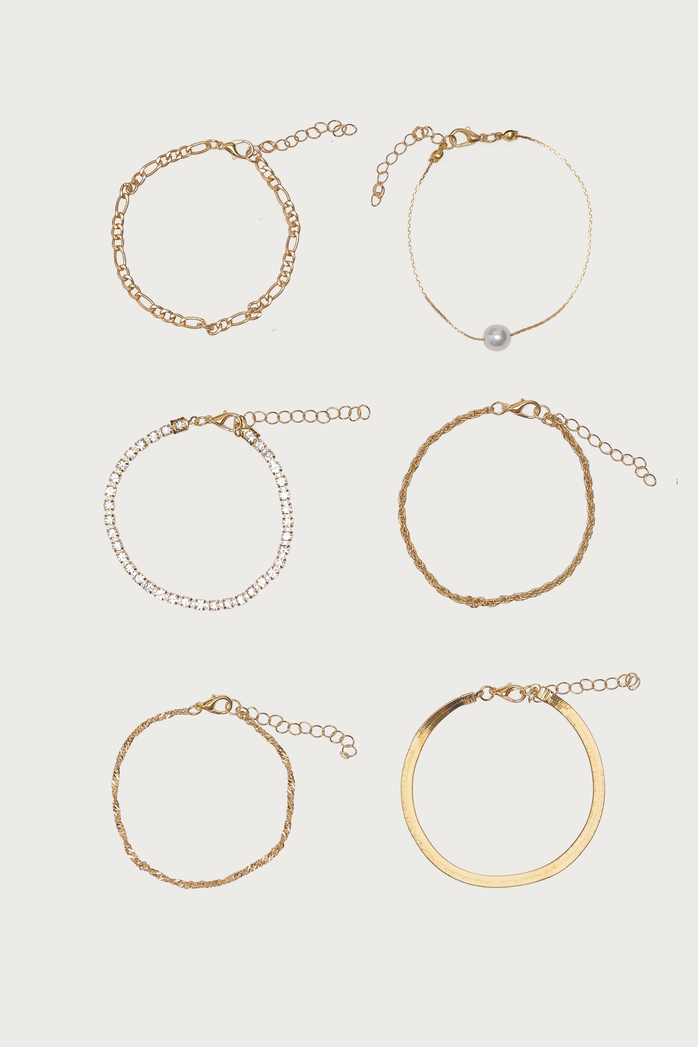 bracelet-pack faux-diamond pearl-detail gold-tone chain-bracelet assorted pack-of-6 6.7-inch stackable jewelry-set metal-bracelet plastic-bracelet party-accessory casual-bracelet women-accessory