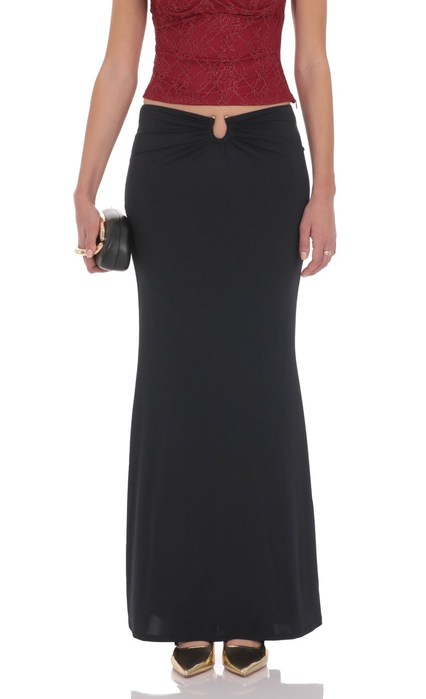 The Francesca Maxi Skirt is a sleek, elongated silhouette designed to sit low on the waist and skim the hips before falling into a fluid, floor-grazing length. Crafted from a smooth, lightweight fabrication, this skirt balances a refined, minimal look with subtle statement detail. The softly gathered front cutout adds a modern edge while keeping the overall feel clean and elevated, making it an effortless piece to dress up or down.