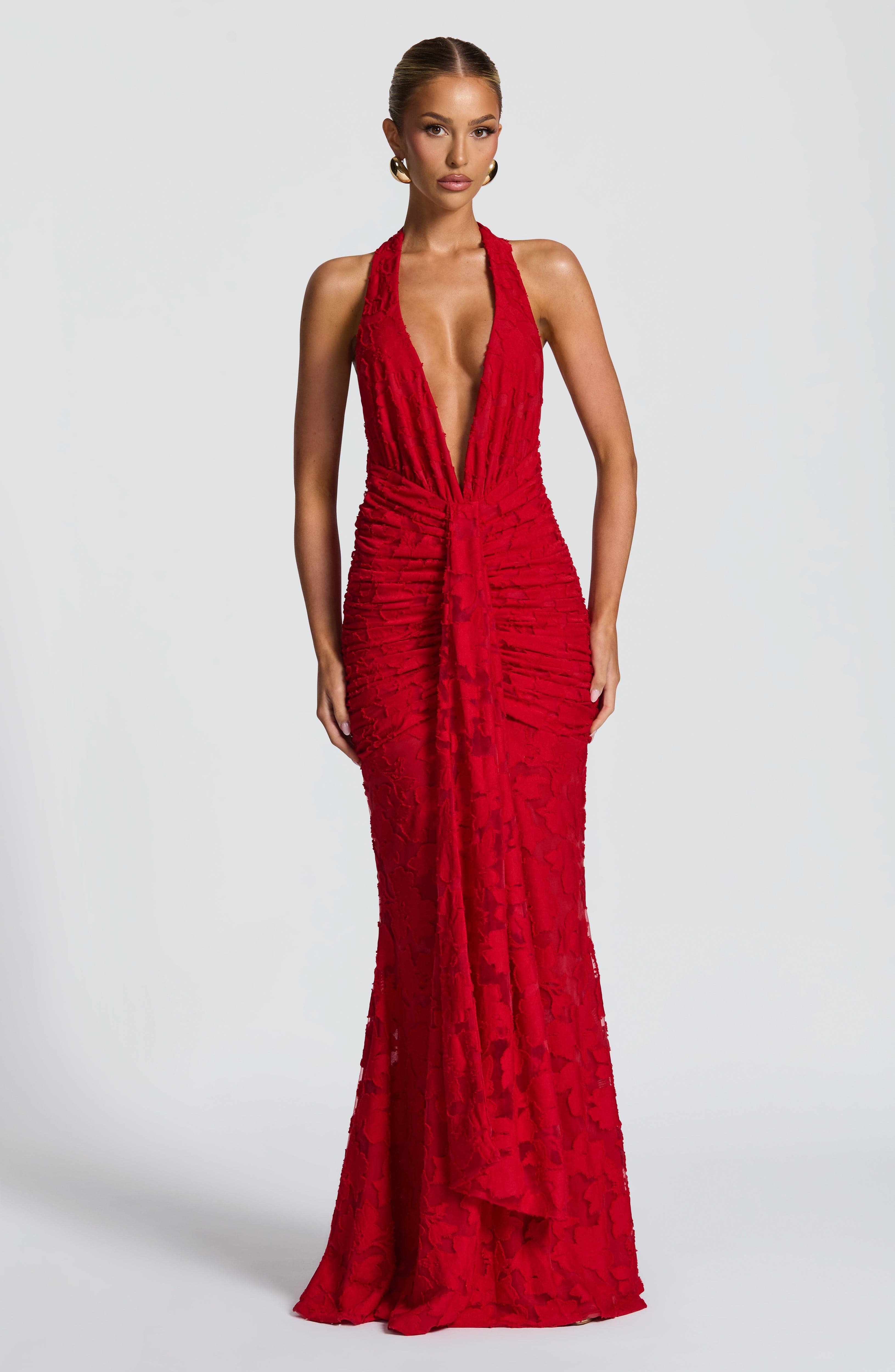 Elevate your wardrobe with the Guinevere Red Maxi Dress, expertly crafted from lightweight custom-designed floral burnout jersey fabric for an elegant, breathable feel. Fully lined for all-day comfort, this stunning dress features a deep plunge neckline, adjustable halter straps with long dramatic ties, and a low V-shaped open back for a bold, alluring silhouette. The draped front panel and tight ruching at the hips create a flattering fit-and-flare shape, enhanced by a thigh-high side split for effortless movement and a touch of allure. Finishing details include a single tie at the center front, invisible zipper closure with hook and eye, and maxi length that drapes beautifully. Perfect for evening events, weddings, formal parties, or as a wedding guest dress, this feminine piece combines sophistication with comfort for special occasions.