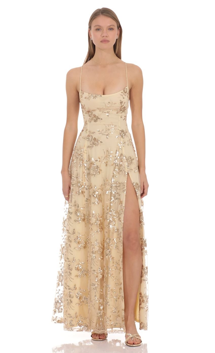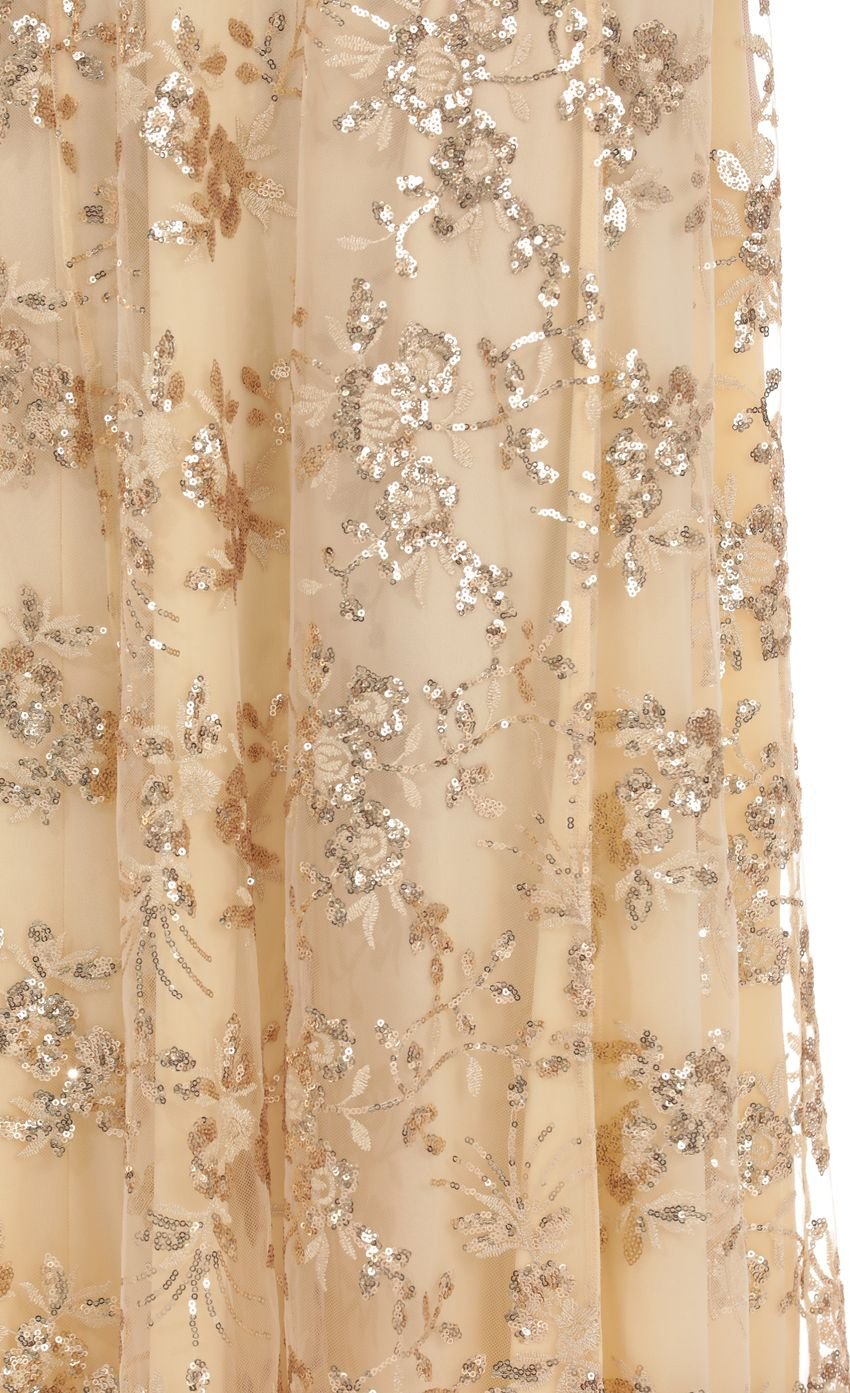 Designed to fit closely through the bodice and waist for a flattering, sculpted shape, while the skirt drapes effortlessly for fluid movement. The allover sequin detailing and open-back design elevate the look, making this an effortless choice for formal events, weddings, or special evenings out.