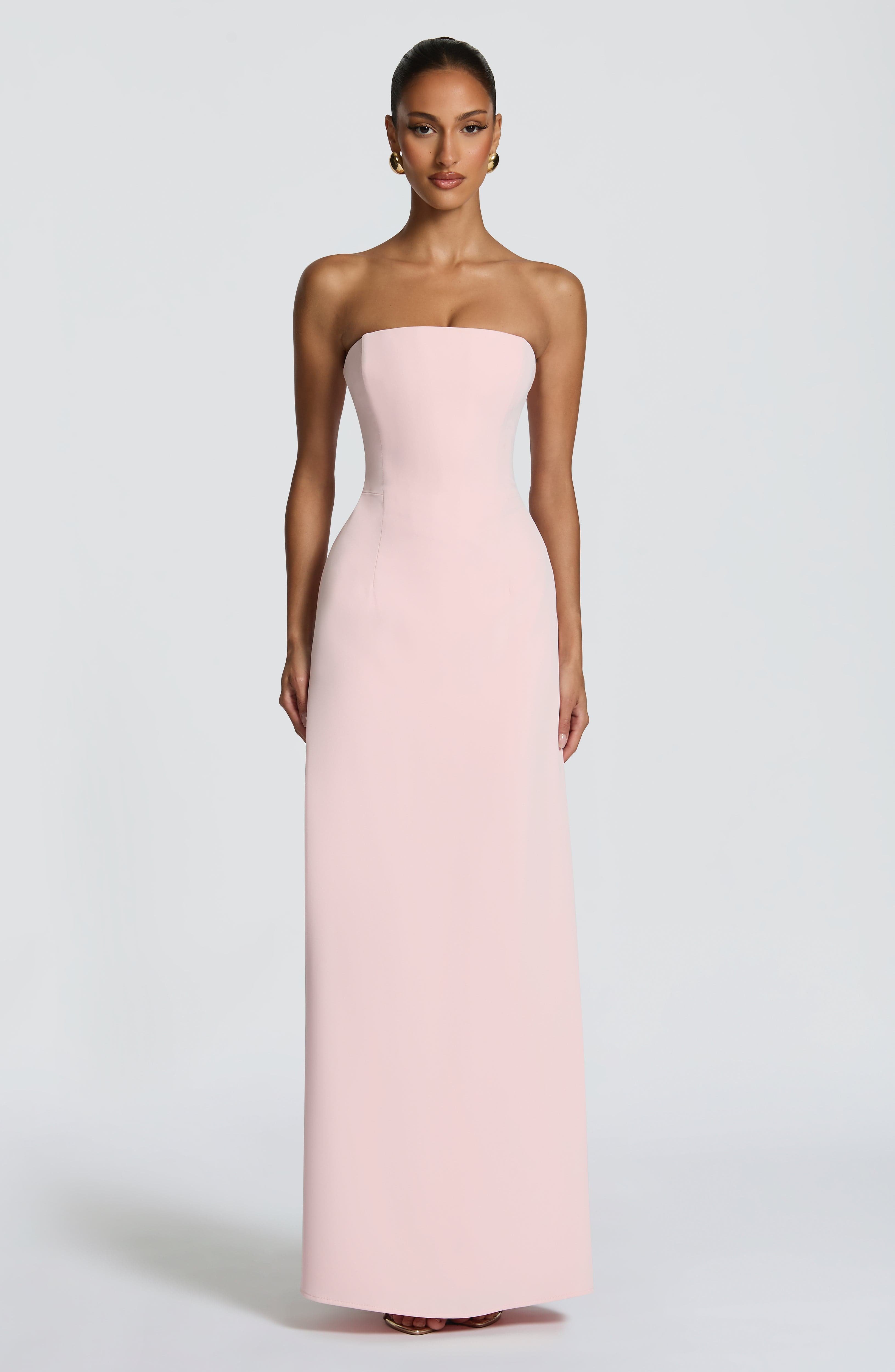 The Irmina Maxi Dress in blush is crafted from elegant non-stretch draped twill for a sophisticated, timeless look. This strapless maxi dress features a straight neckline, fitted silhouette, and maxi length that flatters every curve. An internal corset with boning and lace-up back detail provides a cinched, sculpted fit, while the straight skirt shape adds graceful movement. Fully lined in satin for comfort, it closes with an invisible zipper. Perfect for evening events, weddings, proms, or formal occasions, this blush maxi dress offers versatile styling for bridesmaids, wedding guests, or special nights out. Embrace effortless elegance with its draped fabric and structured support.