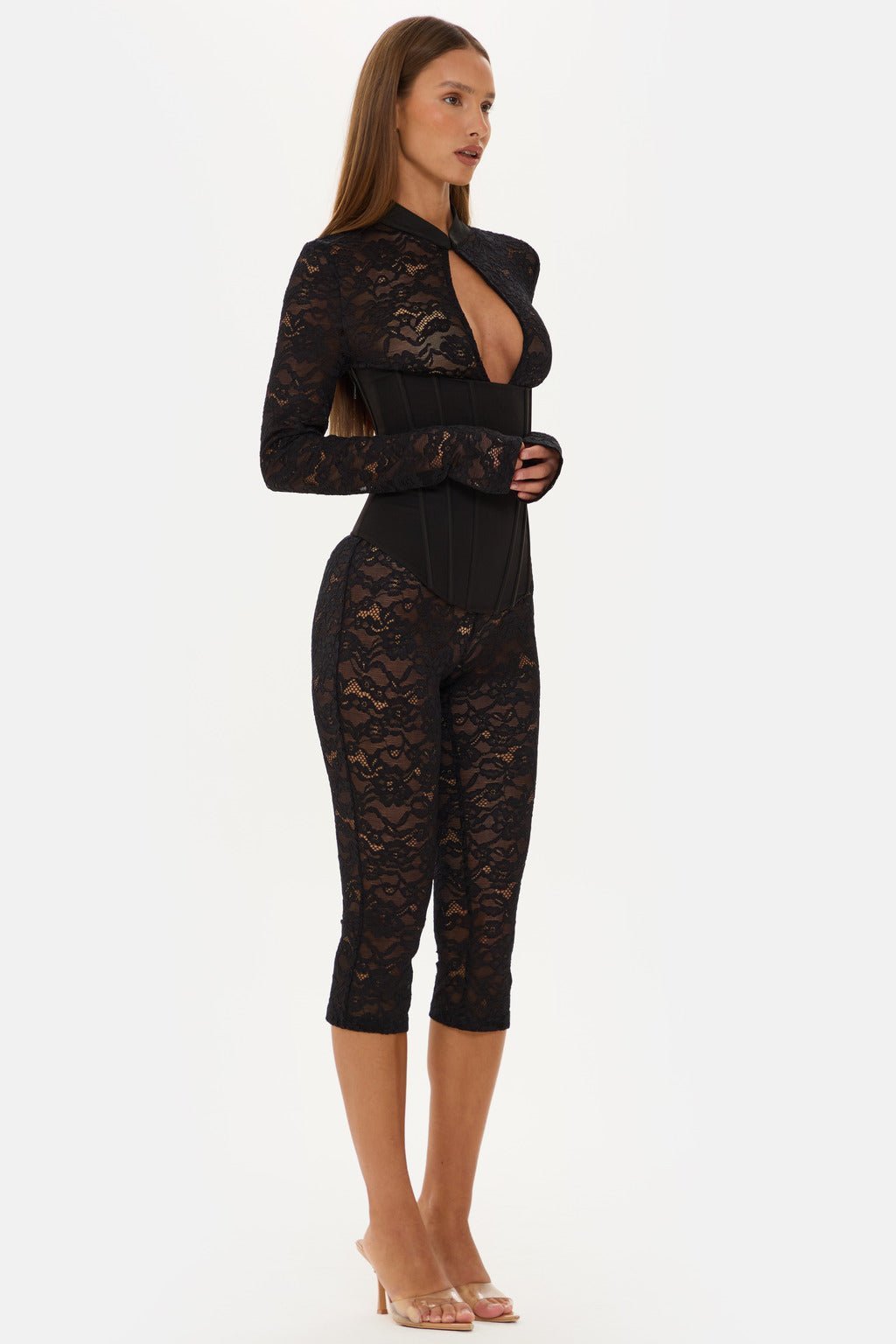 Jagger Long Sleeve Lace Capri Jumpsuit with High Neck and Corset Boning