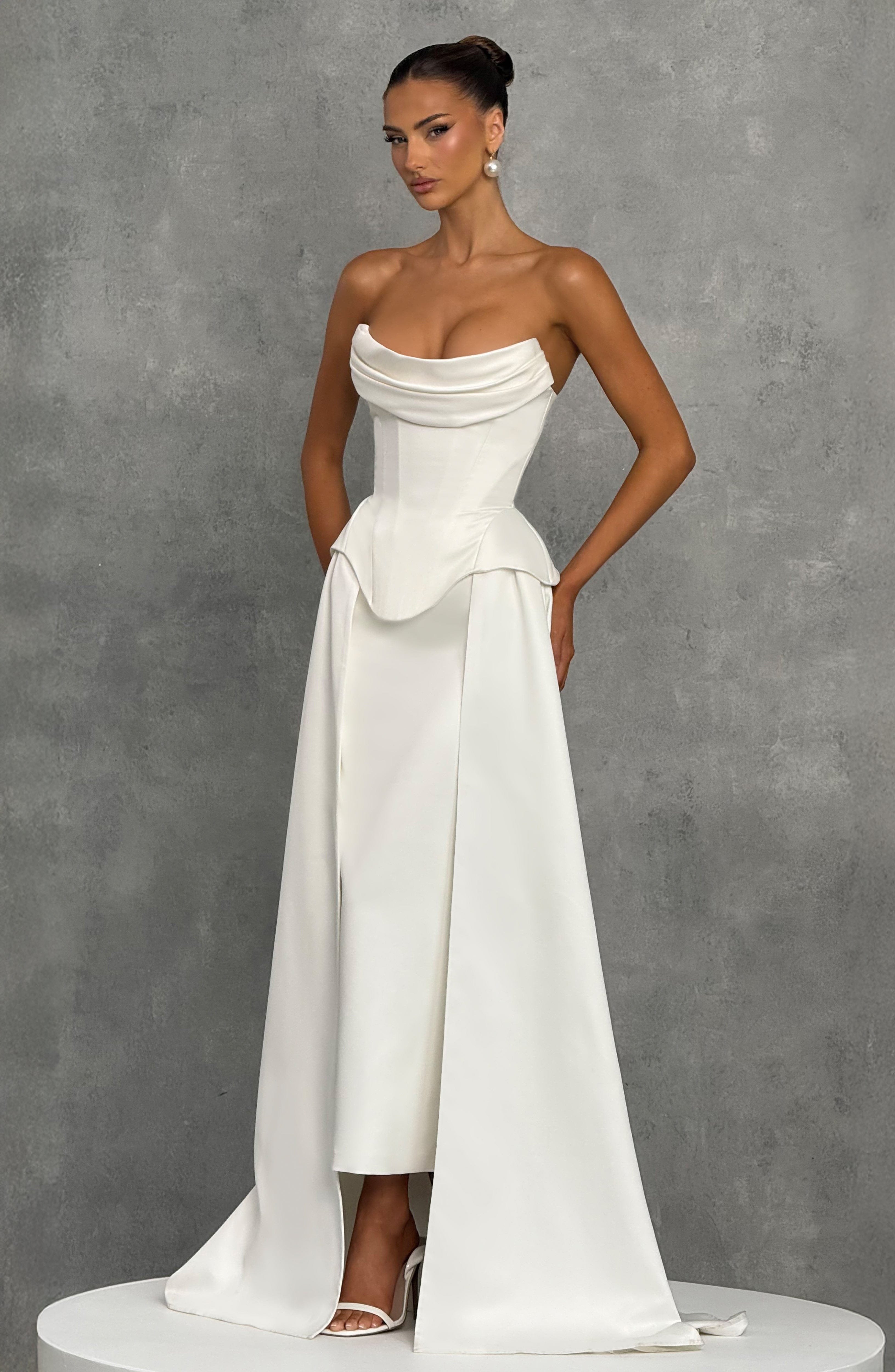 ivory corset bridal duchess-satin boned lace-up scoop-neck cowl-overlay hip-panels wedding bride formal satin fully-lined modern-bridal