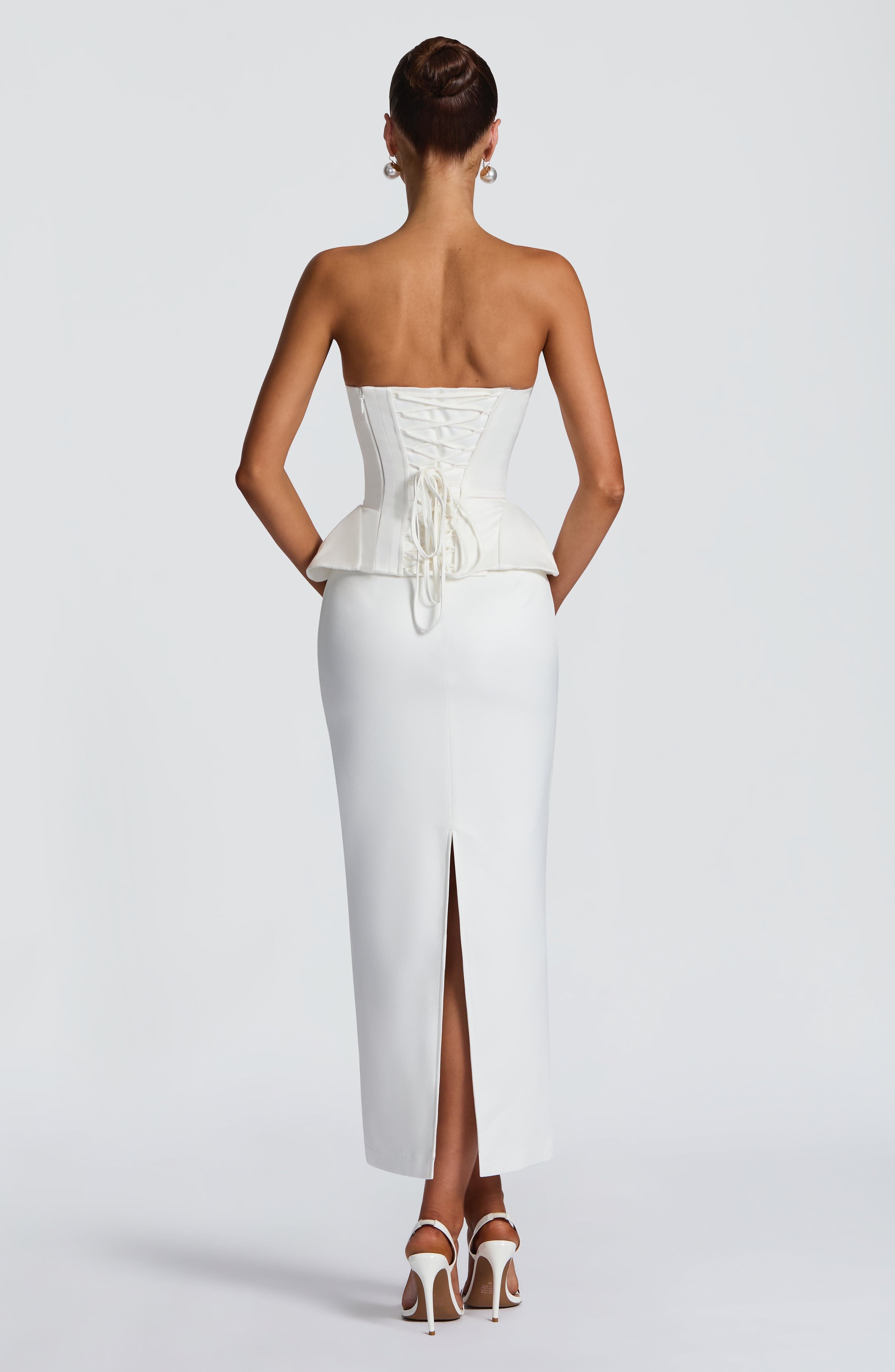 The Jamila Corset in ivory redefines bridal structure with modern elegance. Crafted from luxurious duchess satin, this fully lined piece features a deep scoop neckline softened by a delicate pleated cowl overlay. Internal boning provides sculpting support, while the lace-up back and concealed zip closure ensure a customizable cinched fit. Dramatic exaggerated hip panels create a bold, refined silhouette perfect for the modern bride. Pair with the Calliope Midi Skirt or Neri Train Skirt for a complete bridal look. Ideal for wedding, bridal showers, or formal events where sophistication meets statement-making style.
