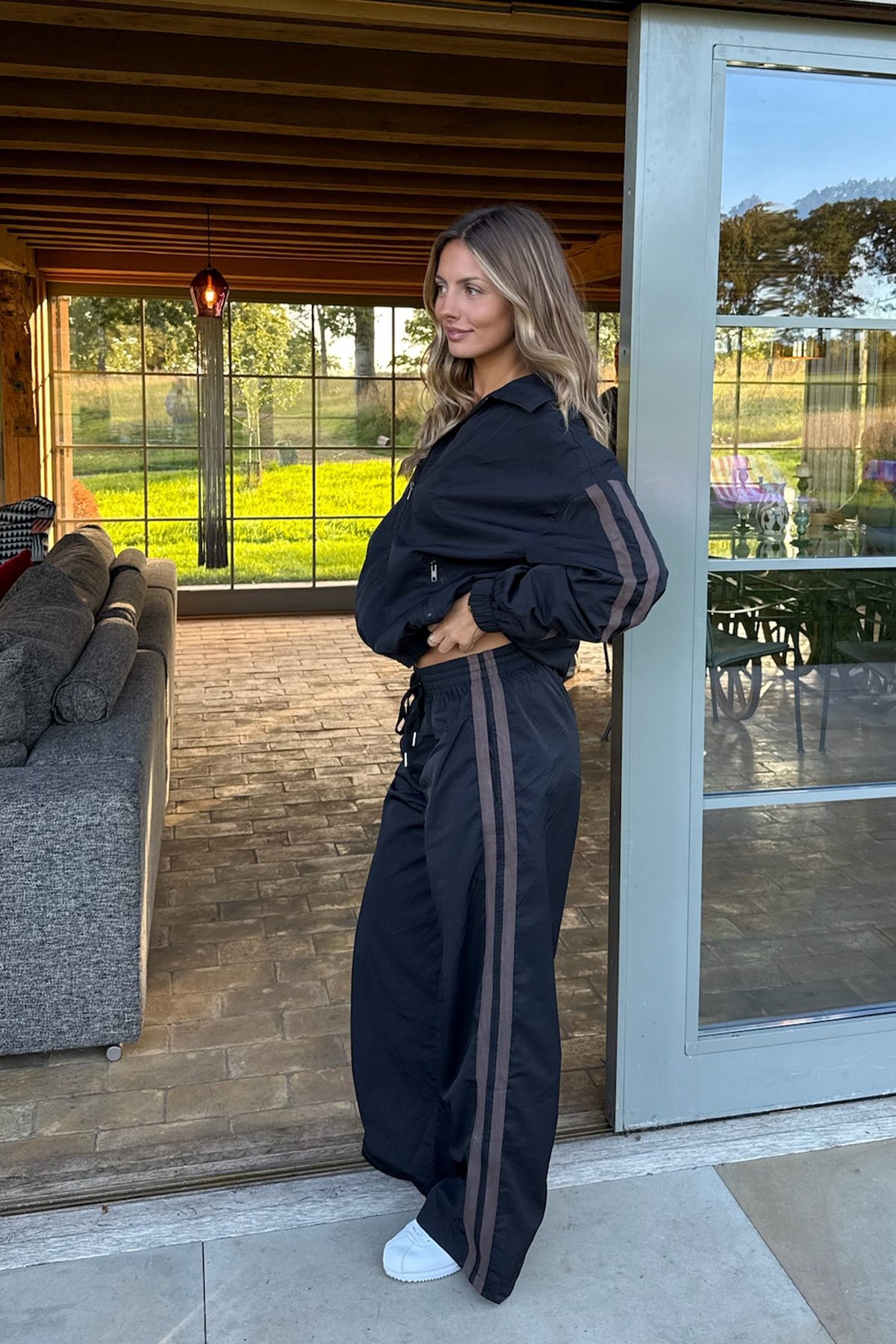 The Kieran Stripey Nylon Track Jacket offers a classic style with a modern oversized fit, perfect for casual everyday wear or layering during active outings. Crafted from lightweight, durable nylon material, it features a classic collar, smooth front zip closure, and bold side stripes for a sporty stripey look. Designed as a matching set piece, this track jacket provides comfort and versatility for various occasions. The model wears size S and stands at 5'8" for reference. Care instructions: Machine wash at maximum 30°C, do not bleach, do not tumble dry, do not iron, do not dry clean. Ideal for men seeking stylish outerwear with easy movement and a relaxed silhouette.