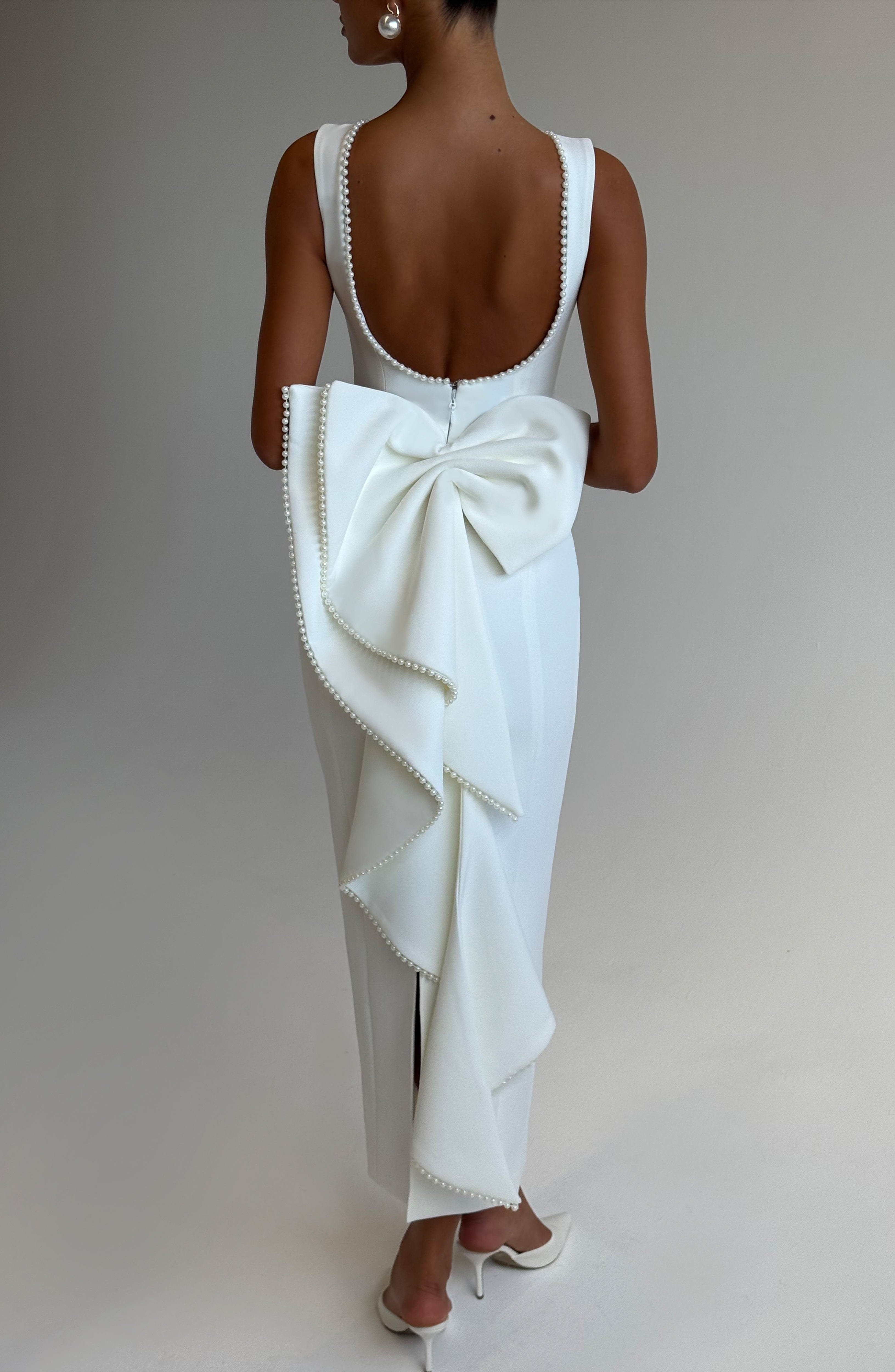 Lana Midaxi Dress in Ivory - Non-Stretch Crepe with Pearl Trim and Detachable Bow