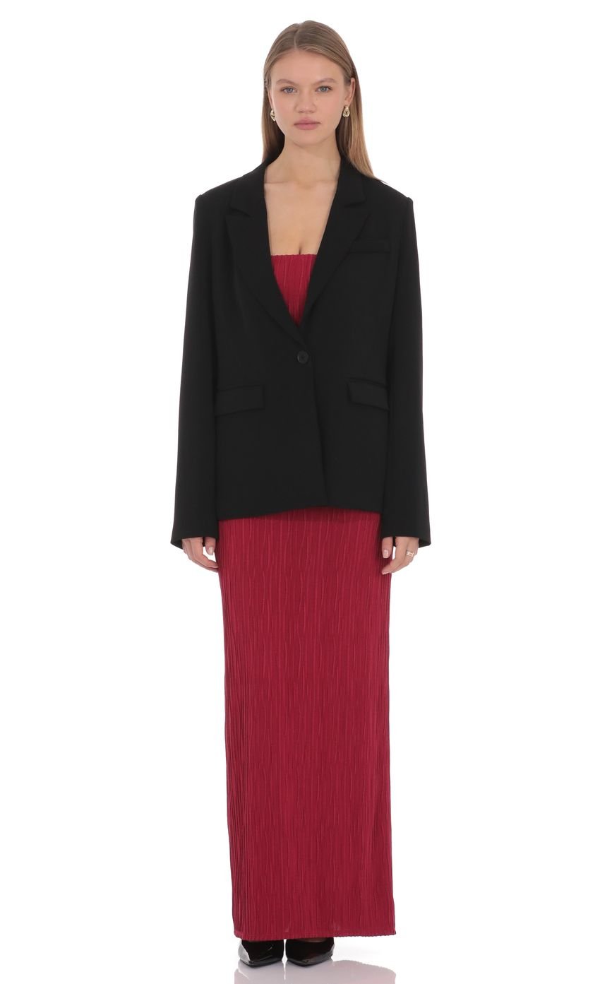 The Lisette Blazer is a refined, sculpted layering piece designed to bring a sharp yet feminine edge to any look. Cut from a structured woven fabrication, this jacket features a classic front balanced by a subtle design detail at the back. A center-back slit is delicately held together with soft bow tie closures, adding a playful contrast to the polished tailoring.