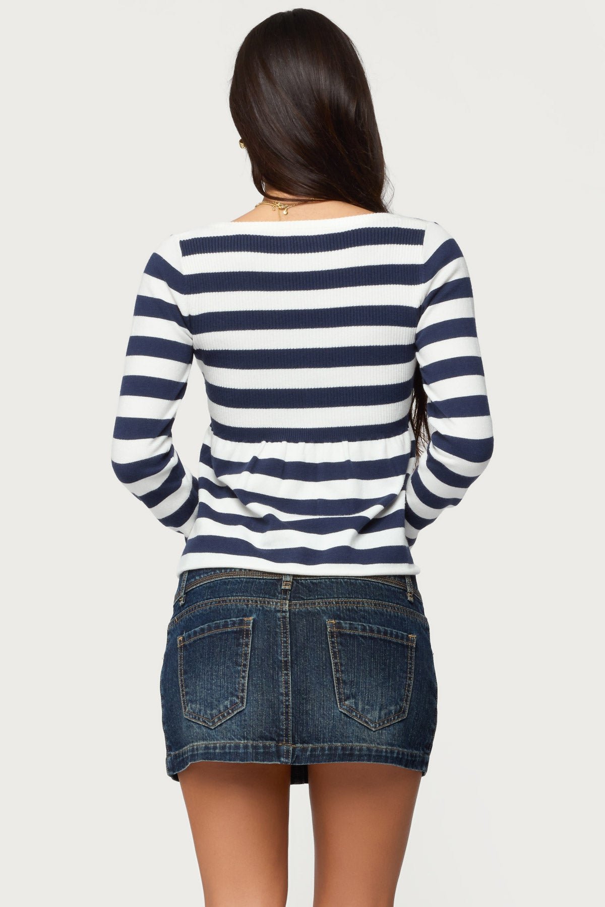 The Lockie Striped Knit Babydoll Top features a flattering babydoll silhouette with long sleeves and a scoop neckline. Detailed with buttons and ribbed trim, this top showcases a classic striped pattern crafted from a soft knit blend of rayon, polyester, and nylon. Perfect for casual outings, layering in cooler weather, or styling for vacation looks. Model wears size S and is 5'8". Care instructions: Hand wash at maximum 30°C, do not bleach, do not tumble dry, iron at maximum 110°C, do not dry clean.