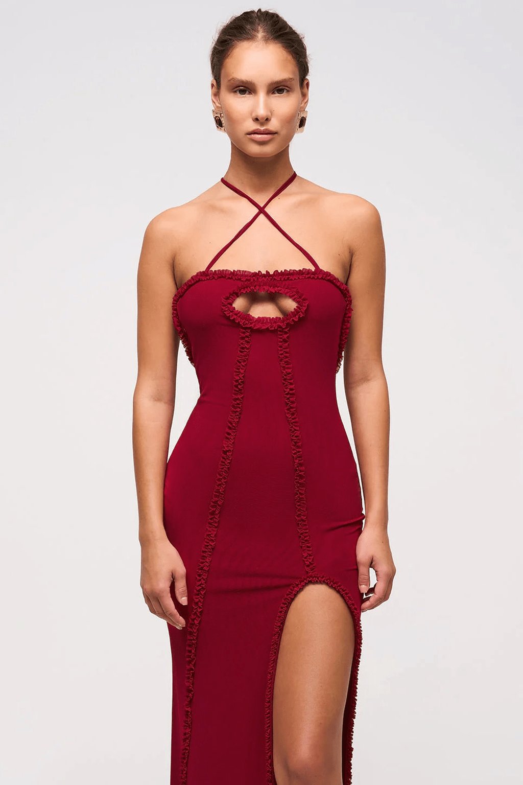 maxi-dress keyhole-dress bodycon mesh-fabric stretchy thigh-split adjustable-straps ruffle-details scooped-back date-night party-dress glam-dress women-dress evening-wear ma-cherie