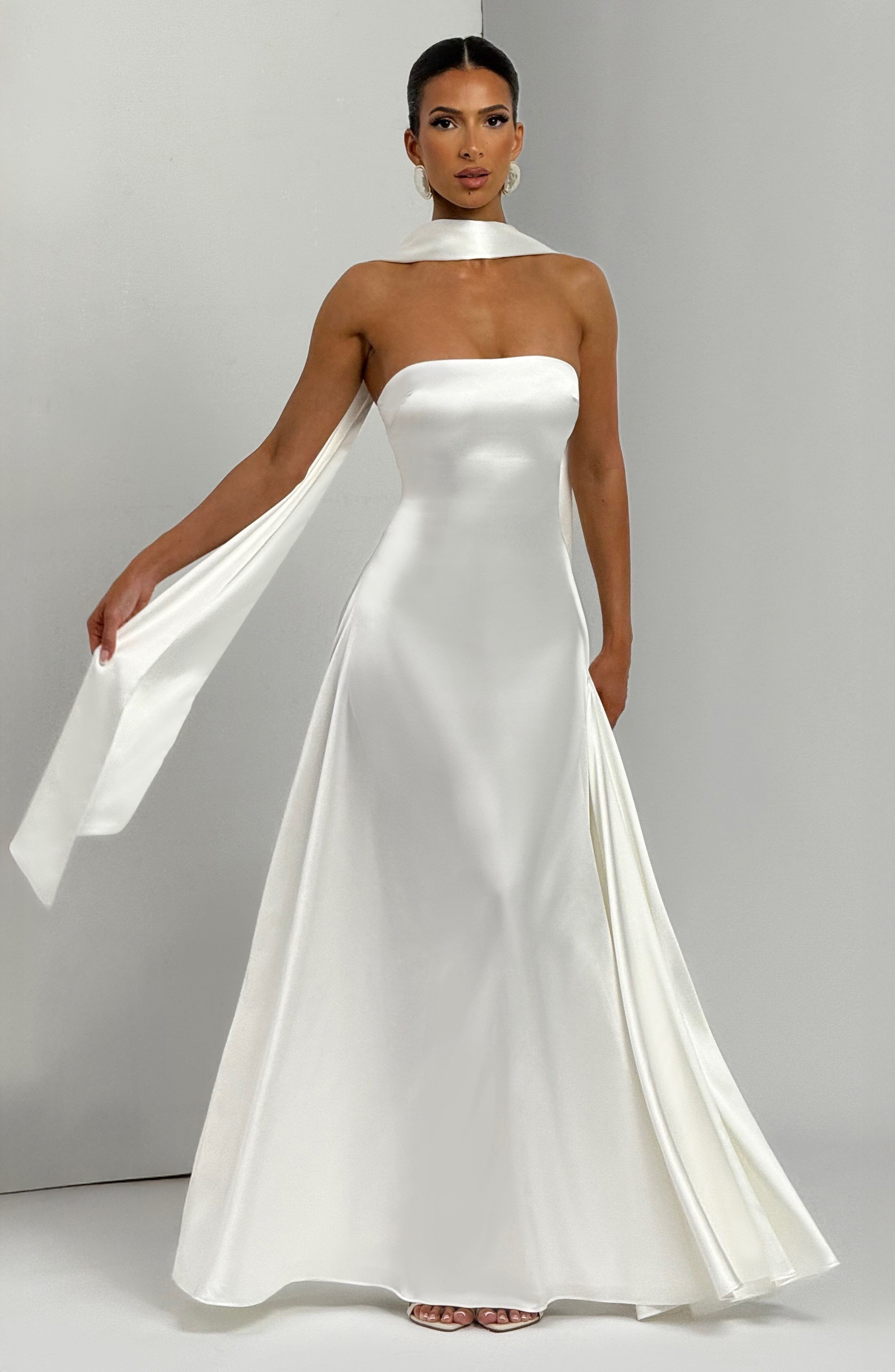 maxi-dress ivory strapless satin a-line lace-up-back fully-lined non-stretch scarf-included formal bridesmaid wedding-guest evening prom party
