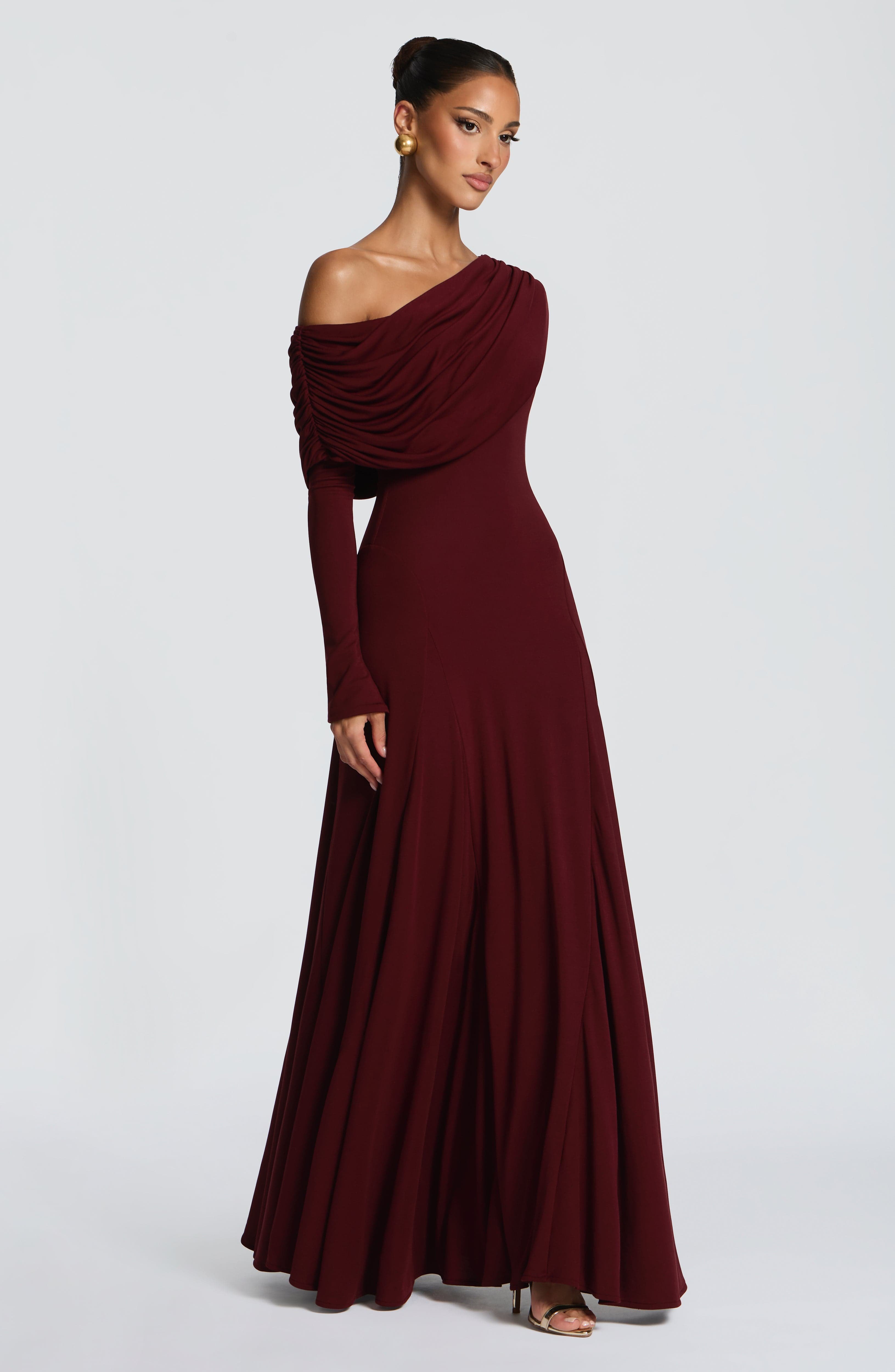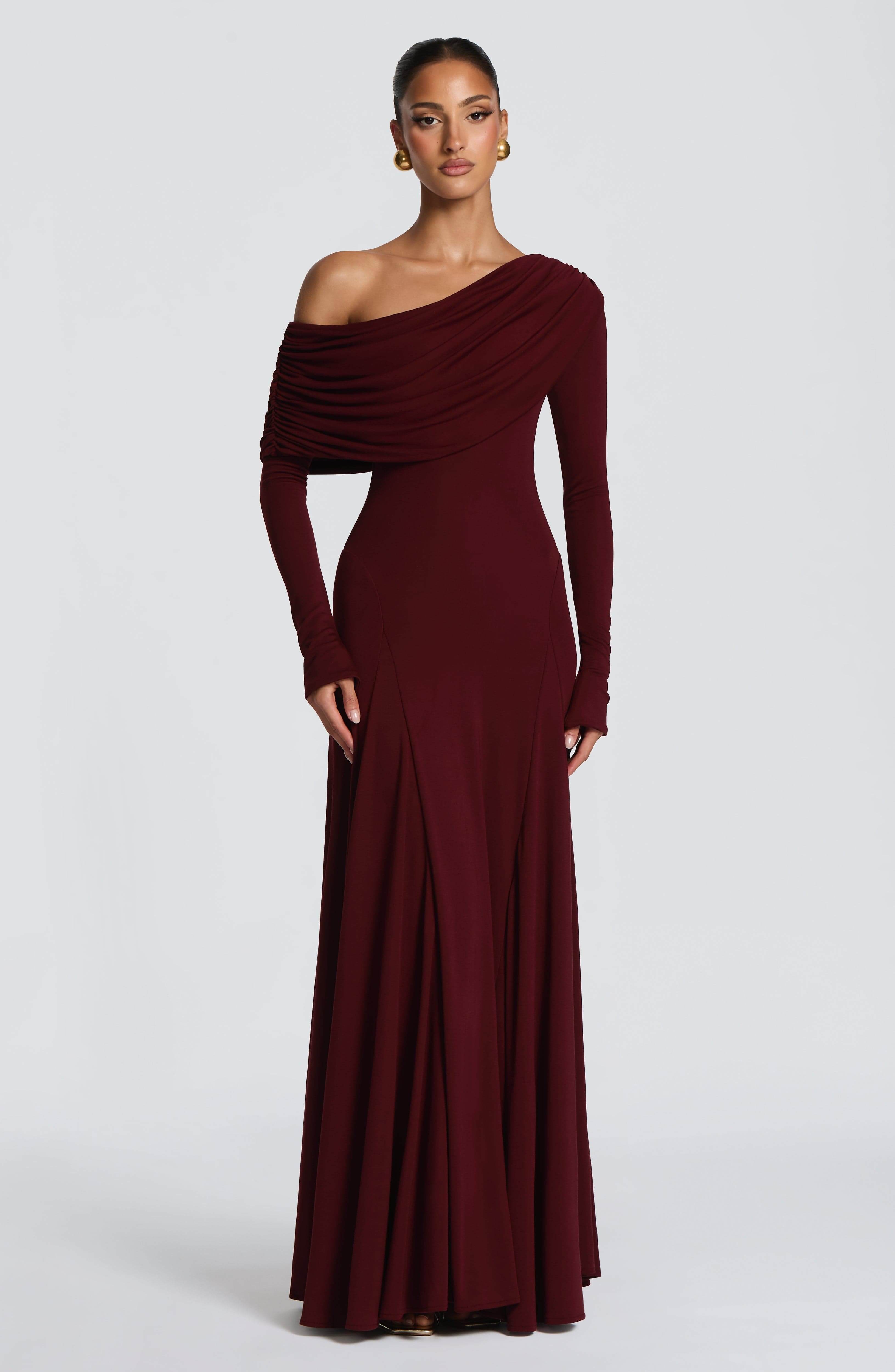 Rafaela Maxi Dress in Cherry Lacquer - Asymmetric Off-Shoulder Modal Jersey Long Sleeve