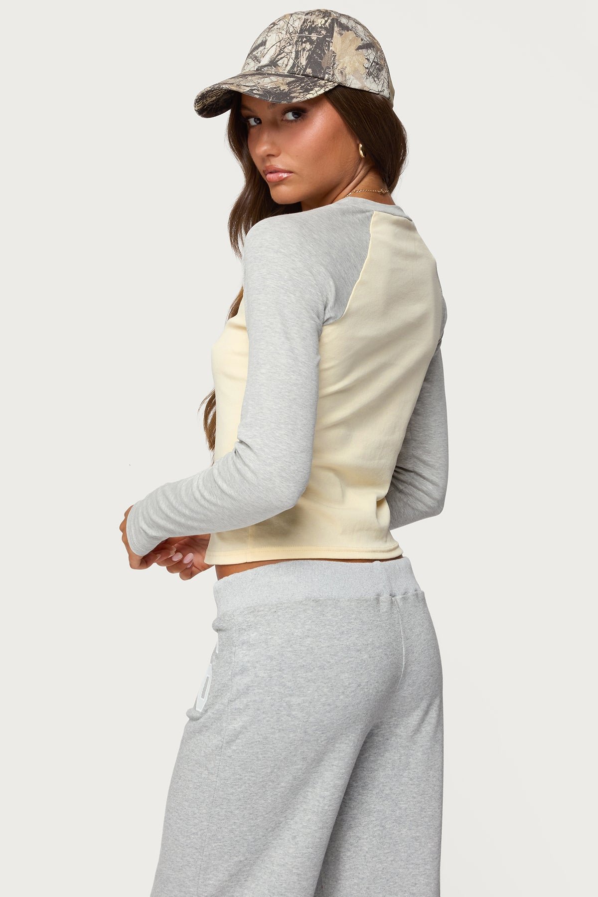 long-sleeve t-shirt contrast-sleeves contrast-neckline cotton-spandex casual-top stretch-fabric machine-washable size-s-model everyday-wear