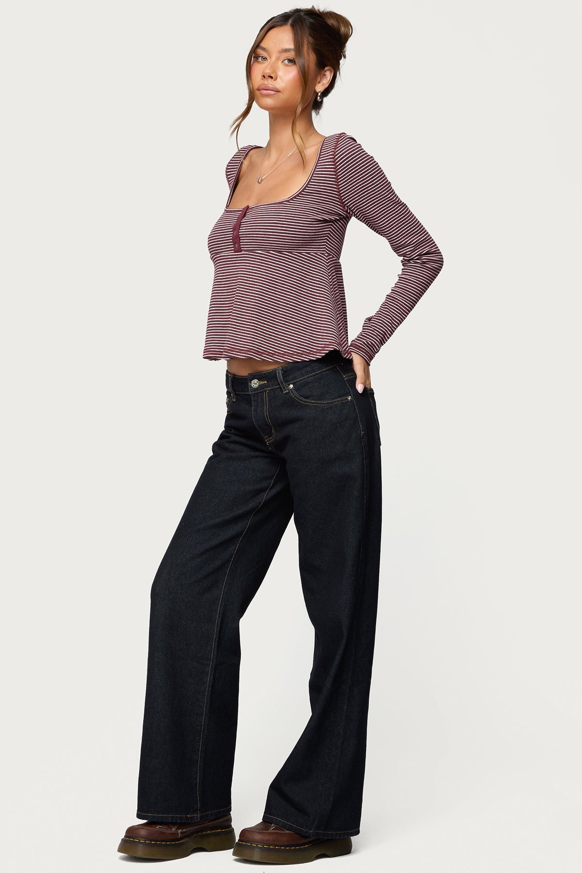 striped babydoll henley long-sleeve square-neck button-detail cotton-blend stretchy casual-top womens-top machine-washable everyday-wear layering-top