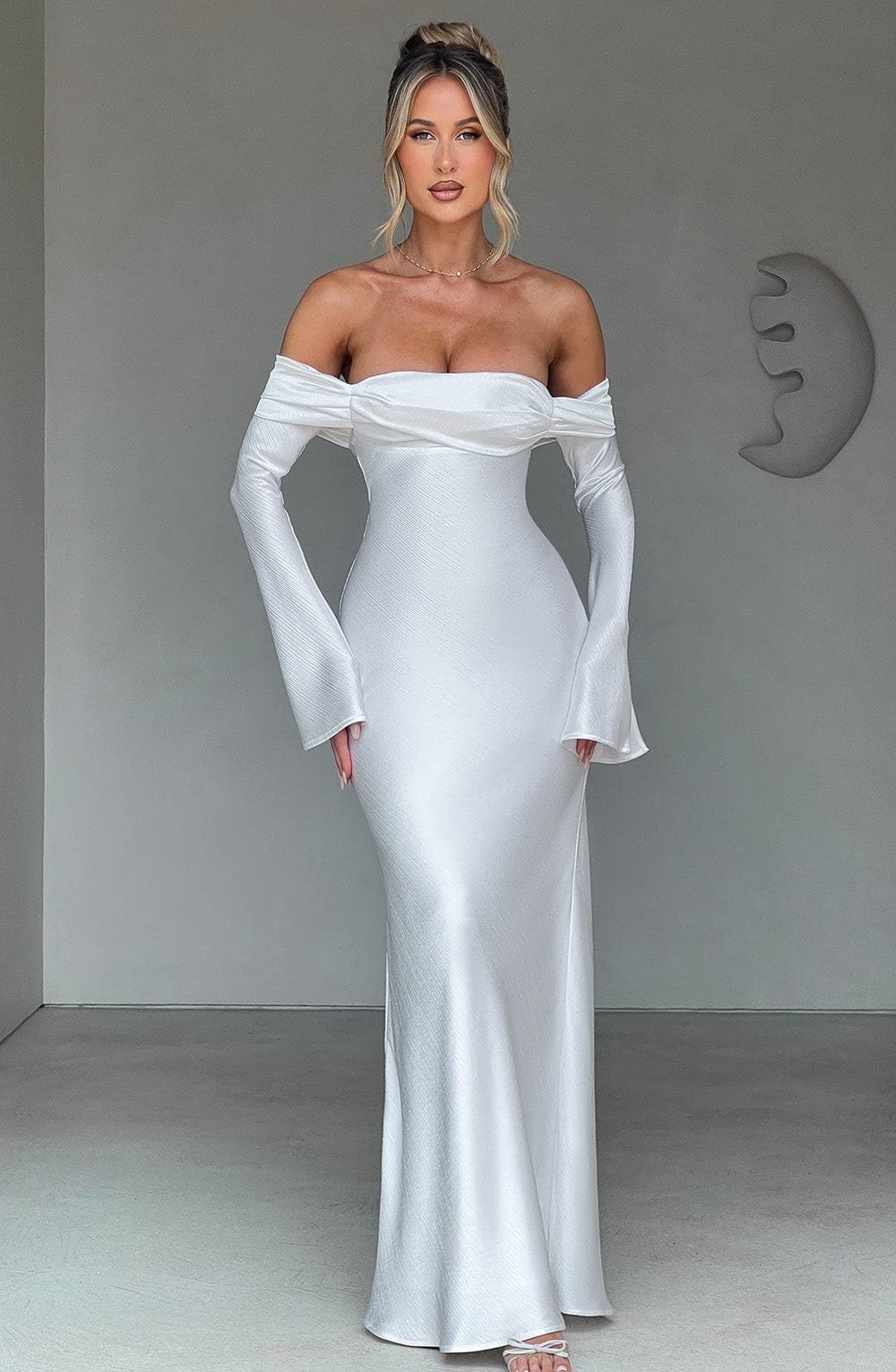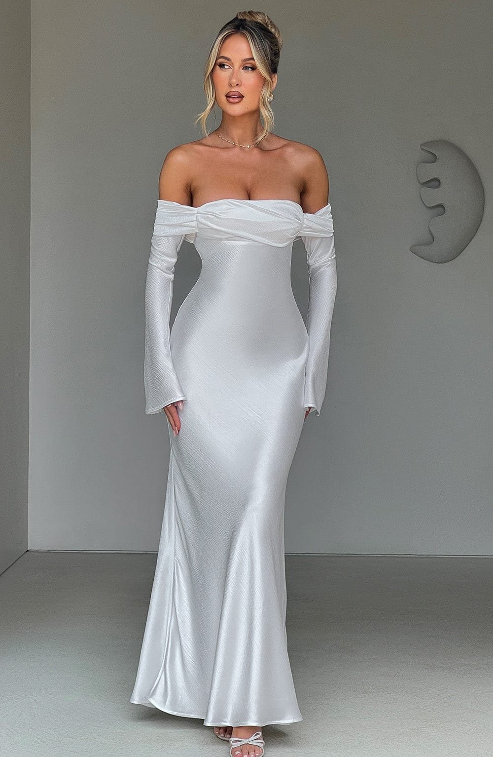 Selene Maxi Dress in Ivory - Textured Satin Bardot Neckline Long Sleeve