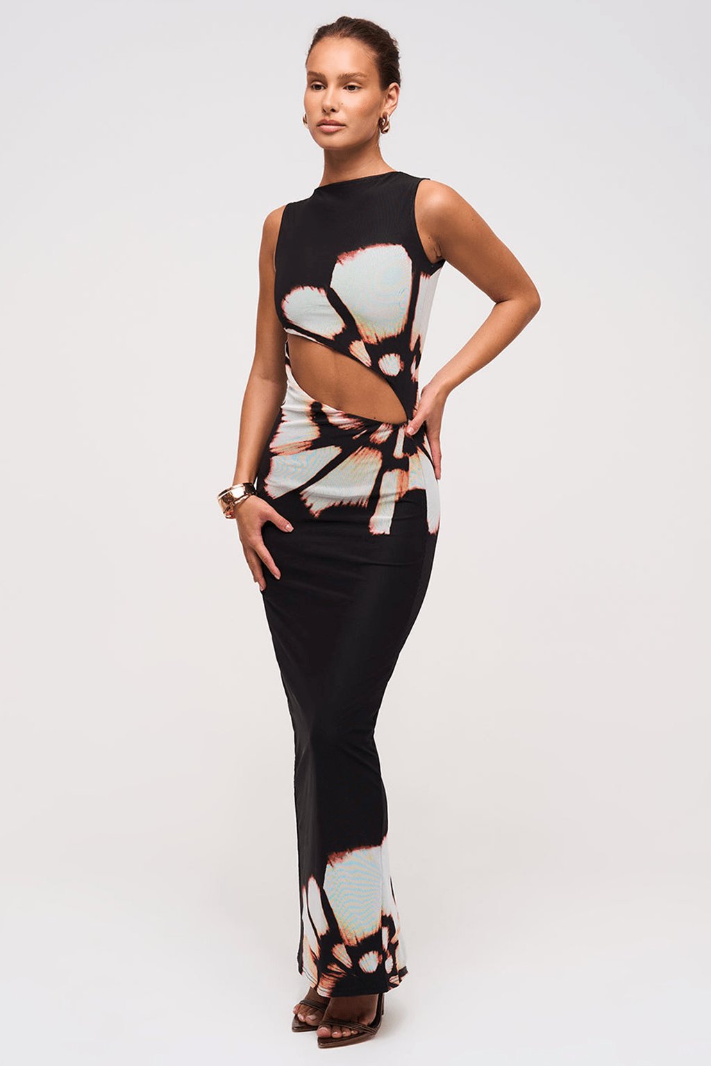 Elevate your wardrobe with the Slash Detail Maxi Dress in Desert Rose. This stunning maxi-length dress features a centre back split at the hemline for easy movement, bold slash details on the front bodice, and a slash neckline for a modern edge. Crafted with a sheer mesh outer layer over a comfortable stretch fabric inner layer, it offers a bodycon fit that hugs your curves while maintaining a modest hemline length of 144cm from neckline to lowest hem (based on US size 4). The exclusive in-house Desert Rose placement print adds a unique, alluring touch. Straight-cut skirt design makes it versatile for various occasions. Bra-friendly construction ensures comfort. Perfect for refined date nights—style with clear heels and gold accessories. Care: Wash at low temperature with similar colors to keep it fresh.