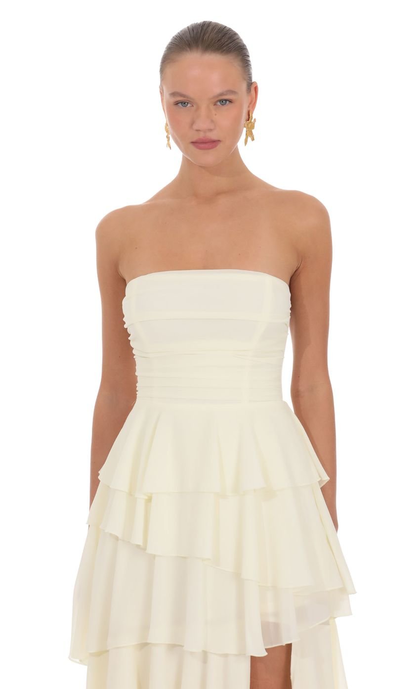 The Stella Maxi Dress is a softly sculpted silhouette designed to contour through the bodice and fall into a fluid, floor-grazing length. Crafted from a lightweight, airy fabrication, this dress delivers romantic movement with a refined, elevated feel. The clean strapless neckline and open back with tie detail create a balanced, feminine look that feels effortless yet statement-making.