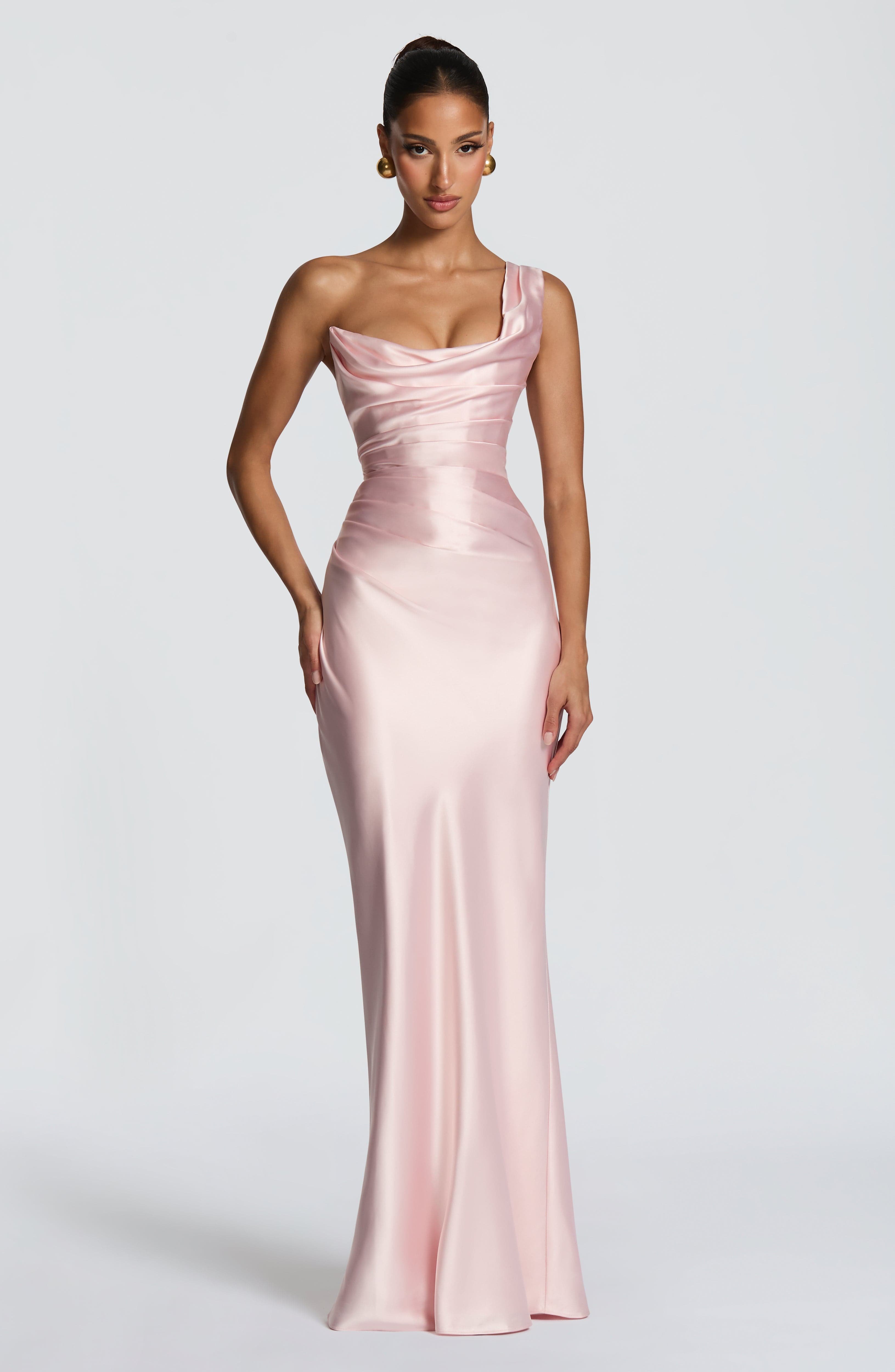 Thalassa Maxi Dress in Blush - Satin One Shoulder with Corset and Lace-Up Back