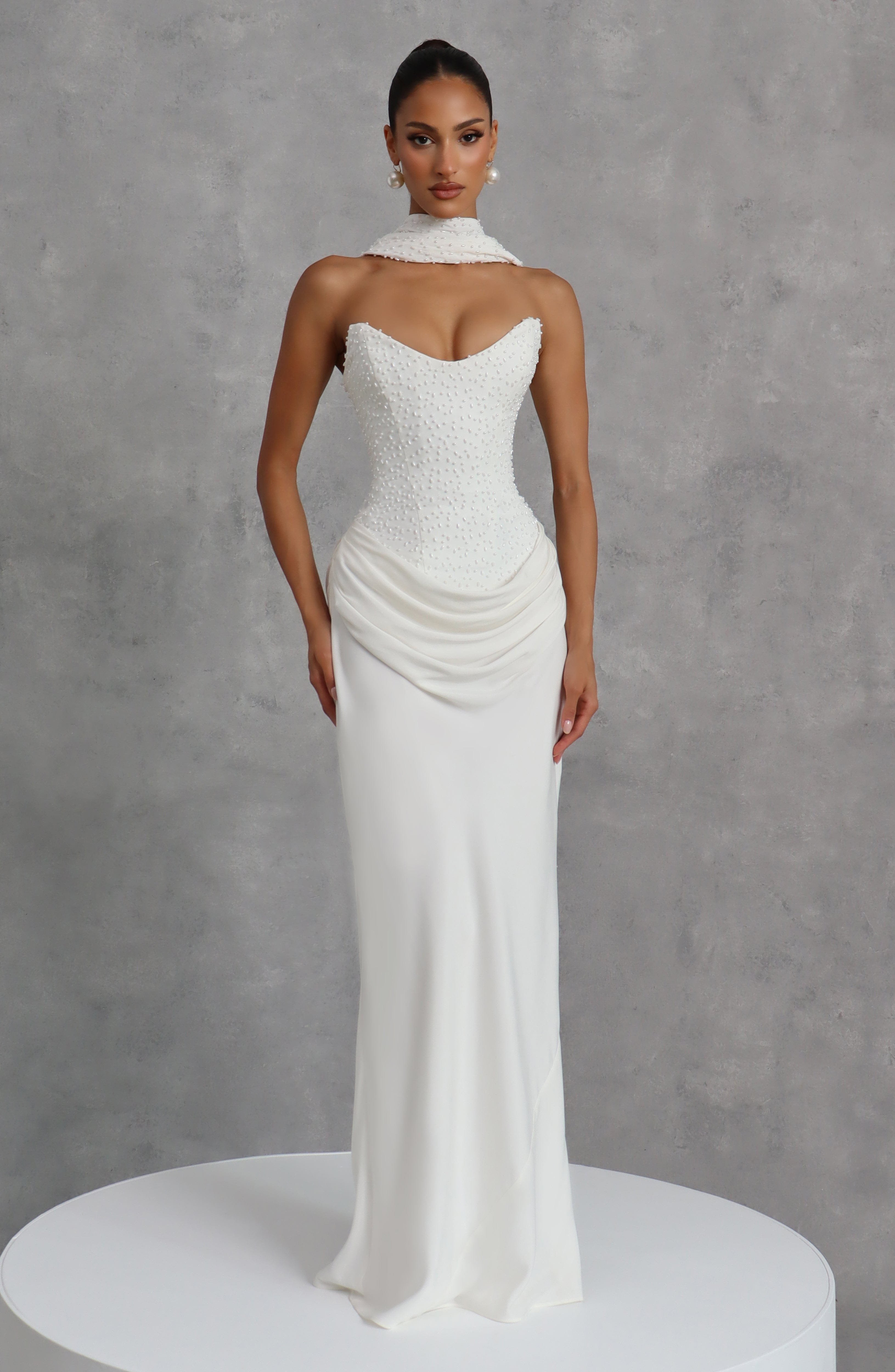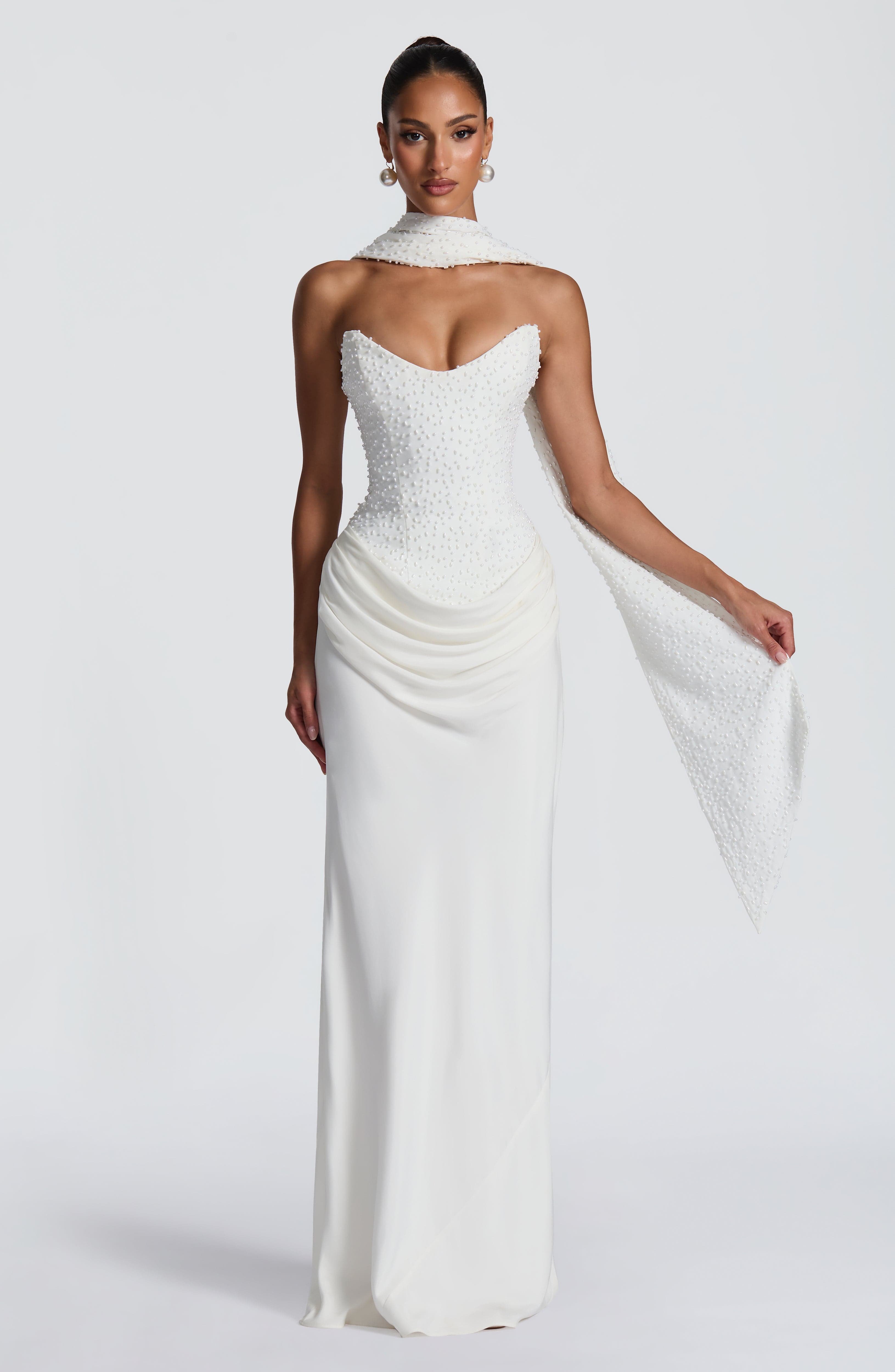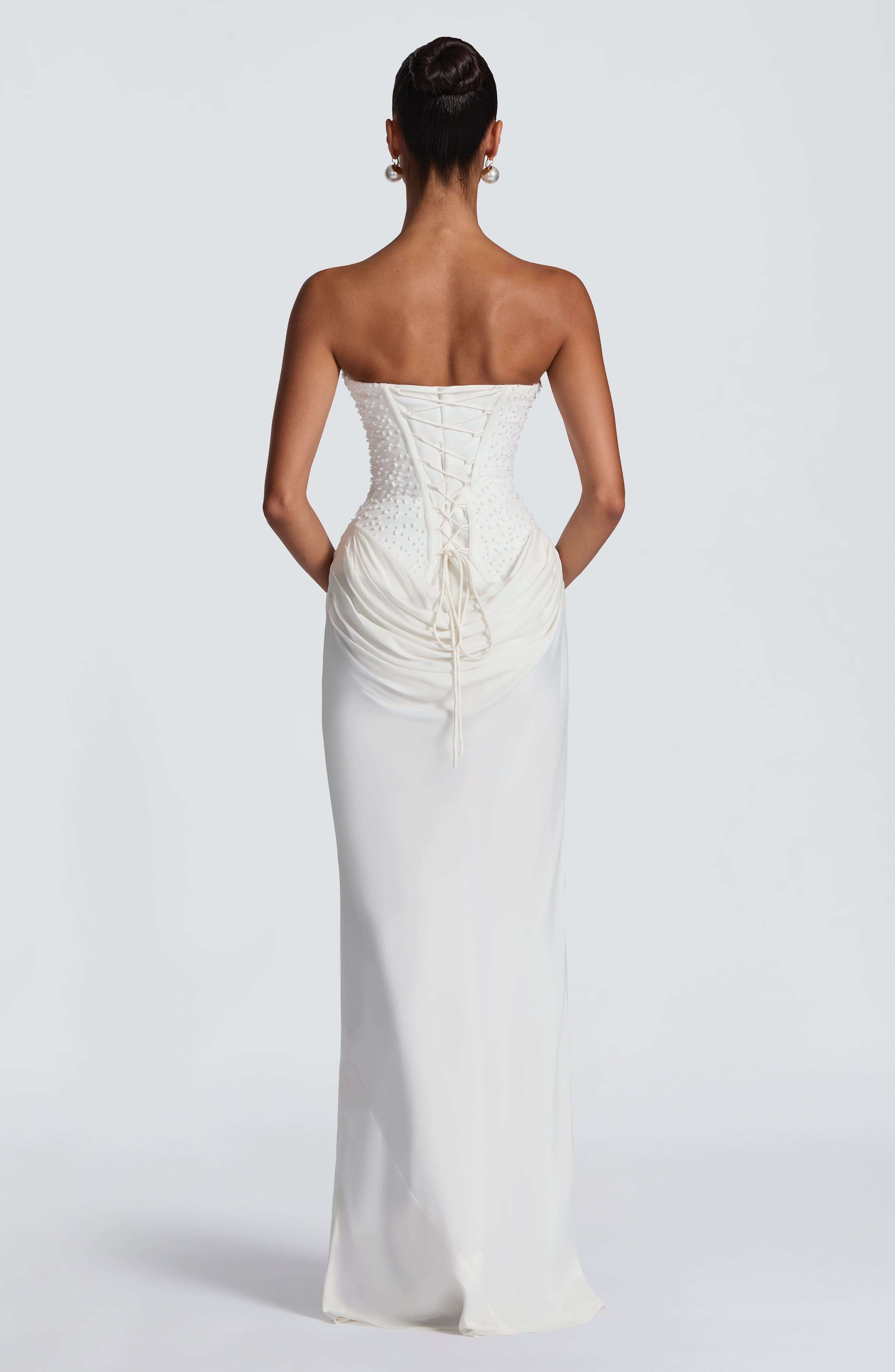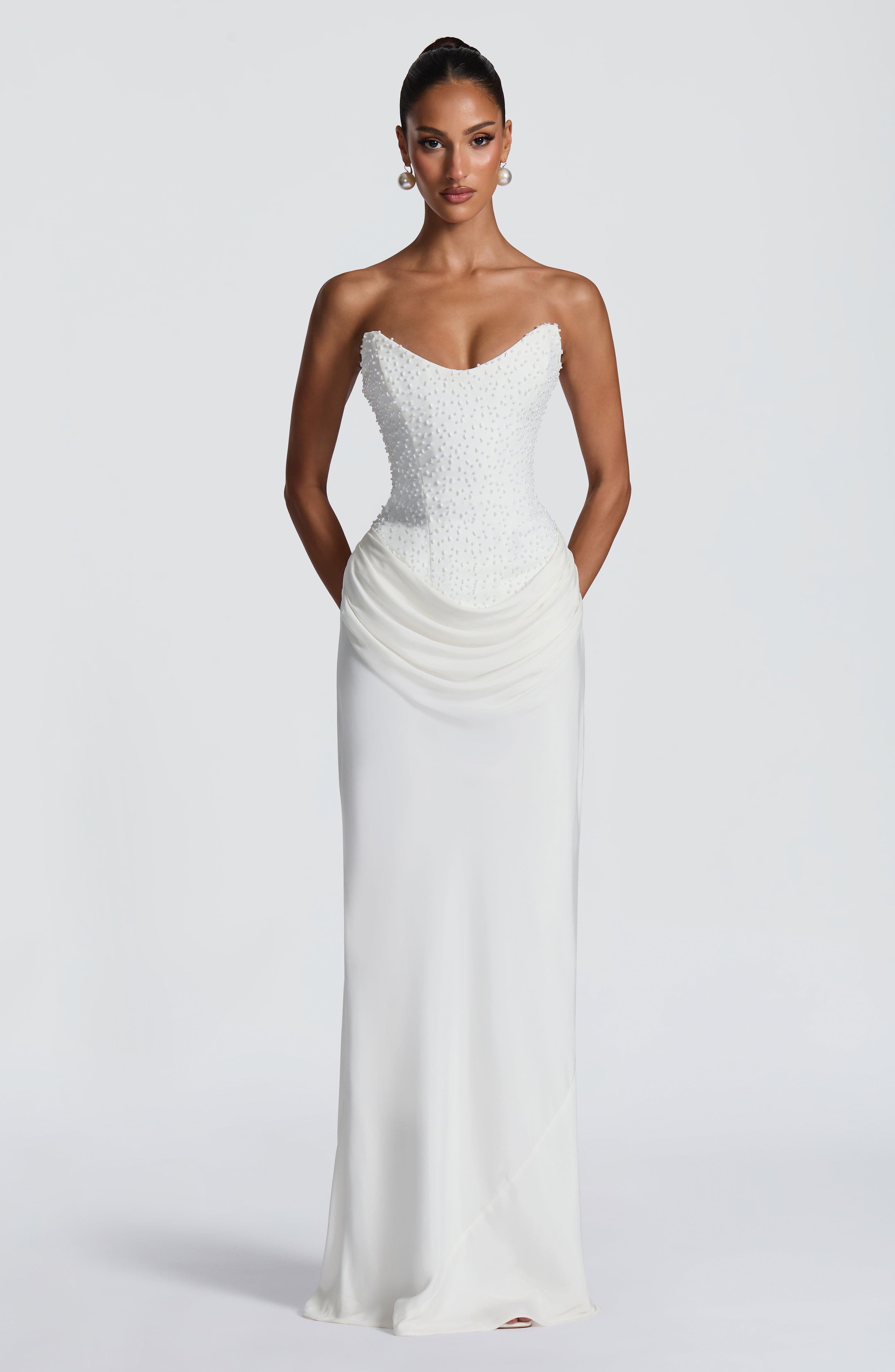 Tindra Maxi Dress Ivory - Pearl Embellished Crepe Bodice Cupro Skirt Strapless