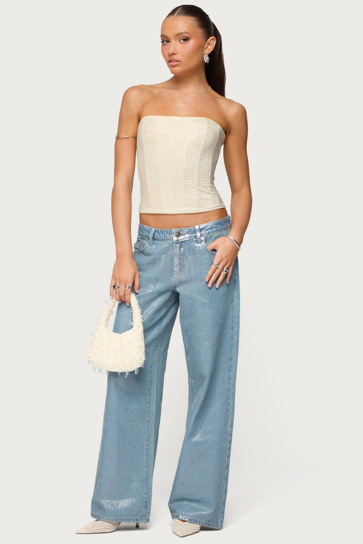 Elevate your style with the Vezza Strapless Rhinestone Corset, a stunning strapless top featuring sparkling rhinestone fabric for a glamorous shimmer. Crafted from a premium blend of polyester and spandex, it offers a comfortable stretch and structured fit thanks to the boned bodice that provides shape and support. The lace-up back closure allows for adjustable sizing and a customized silhouette, perfect for achieving that coveted hourglass figure. Ideal for party outfits, evening events, cocktail parties, or festival wear, this corset pairs effortlessly with skirts, pants, or jeans for versatile styling. Model wears size S and stands at 5'8". Care instructions: Hand wash only, do not bleach, do not tumble dry, do not iron, do not dry clean. Add this must-have piece to your wardrobe for bold, eye-catching looks.