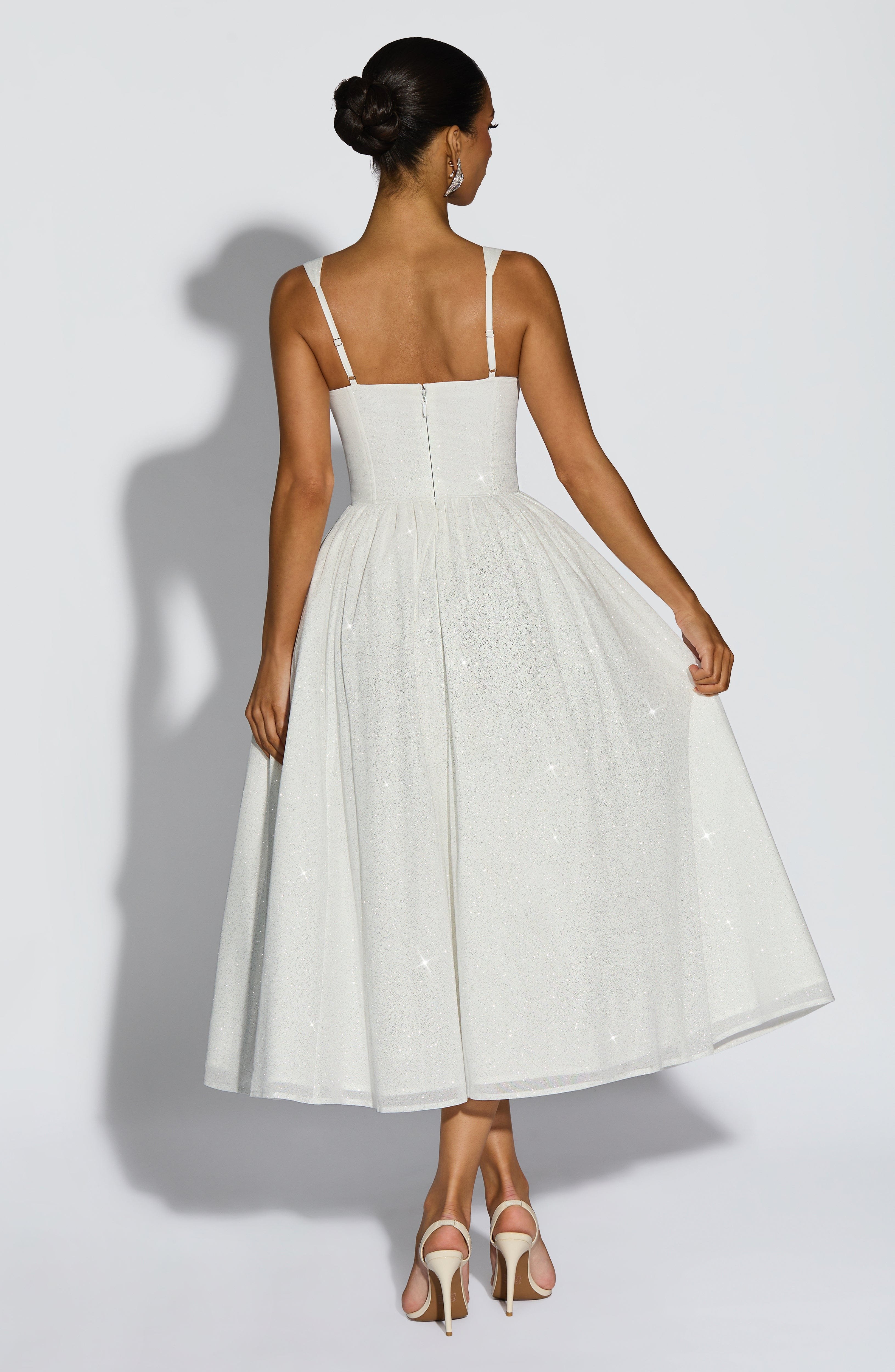 Vivienne Midi Dress Ivory Sparkle Boned Bodice Corset Waist Gathered Skirt